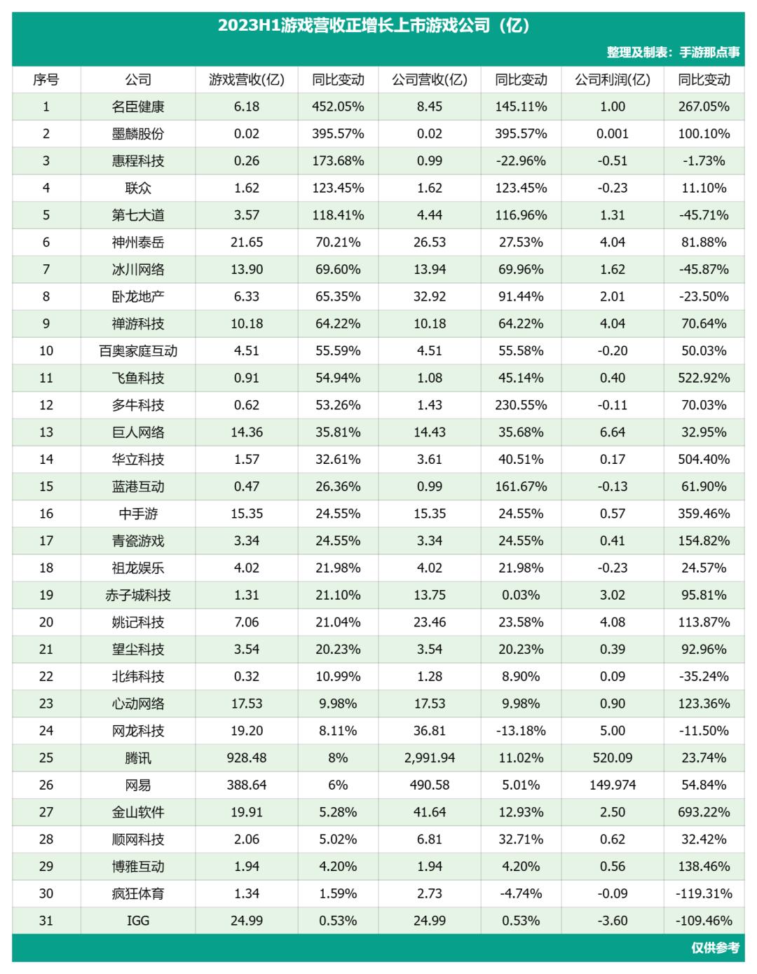 具体到营收层面,目前统计的71家上市游戏公司共有43%(31家)的厂商获得同比增长,其中我们不乏看到名臣健康、惠程科技(哆可梦)、第七大道等厂商获得超过100%的大额增长。而腾讯、网易H1也凭借8%和6%的同比涨幅跑赢市场大盘(同比下降2.39%)。