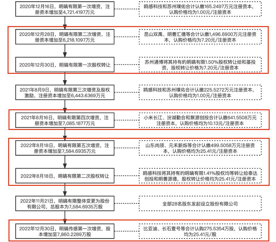 其中,2021年8月,小米长江以4000万元对价认缴了公司新增注册资本394.8005万元;2022年12月,比亚迪以4950万元取得了公司新增股本194.8429万股。截止目前,小米长江、比亚迪分别持有公司5.02%、2.48%的股份。