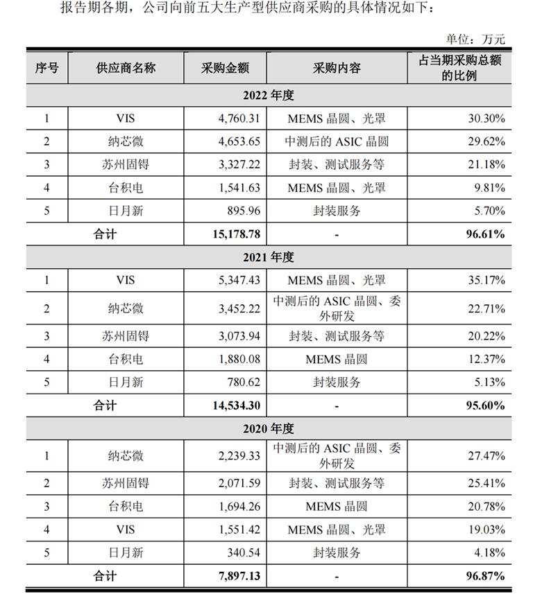 作为规模居全球头部的晶圆代工厂,台积电、VIS(Vanguard International Semiconductor Corporation,世界先进积体电路公司)等公司也成为了明皜传感的主要供应商,报告期内两家公司合计采购金额分别为3245.68万元、7227.51万元、6301.94万元,分别占当期采购总额的39.81%、47.54%、40.11%。
