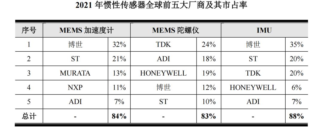 其中惯性传感器市场规模在2021年为35.09亿美元、39.39亿颗,而市场仍由国际大厂把持,MEMS加速度计、MEMS陀螺仪、IMU市场的前五大厂商均为国际大厂,分别占据各自市场的84%、83%、88%。