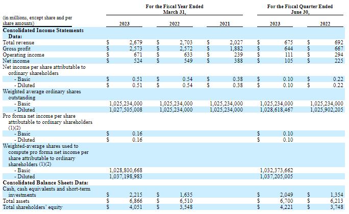 业绩方面,截止3月31日的2021财年、2022财年、2023财年,Arm的收入分别约20.27亿美元、27.03亿美元、26.79亿美元,对应的净利润分别约3.88亿美元、5.49亿美元、5.24亿美元,存在一定波动。