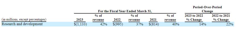 不过搞半导体研发是件非常耗钱的事,这从Arm的研发费用中也能看出来。截止3月31日的2021财年、2022财年、2023财年,Arm的研发费用分别为8.14亿美元、9.95亿美元、11.33亿美元,呈逐年上升趋势,占总收入比例分别为40%、37%、42%。