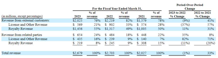 据招股书,2021财年至2023财年,公司的版税收入占比在60%左右,明显占比更高。