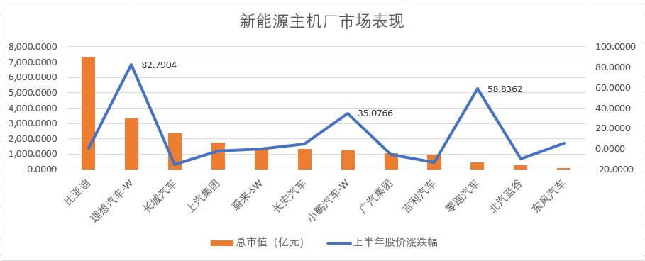 对应到二级市场表现,单车毛利率成为了公司市值变动的第一锚点:刚刚提到的逆势改善了单车毛利的理想和零跑,上半年分别以82.79%和58.84%领涨板块。