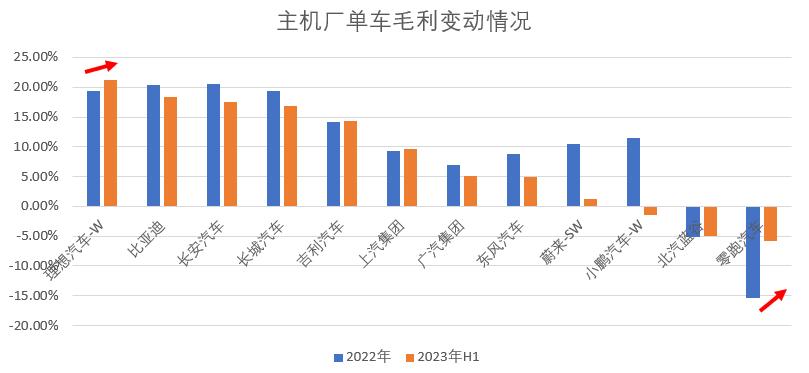 从上半年的数据来看,在上半年水深火热的价格战中,行业整体单车毛利率均值下降2pct,从去年年底的10.86%调整到到2023年H1的8.24%。除了理想继续一骑绝尘外,只有少数企业一定程度改善了自身单车毛利,比如零跑、吉利等。