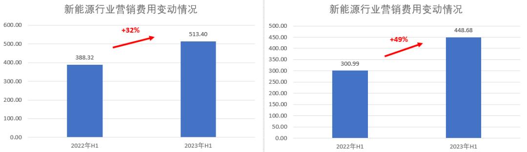 从行业整体投入情况来看,新能源行业上半年营销与研发投入体量都有较大提升,不过对比下来,还是遵循着研发>营销的逻辑。