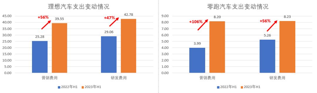 而理想和零跑的经营策略与行业发生了一定背离,这两家企业的营销支出增长幅度显著高于行业均值,同样也高于同期研发支出的增长幅度。也就是说,比起死磕研发,目前阶段新能源行业中,除了我们看到的低价竞争外,营销更能“疗效短、见效快”地改善新能源车企经营状况。