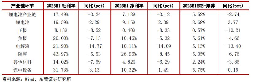 2、电池产业链利润向动力电池转移。由于电池原材料产能过剩情况更严峻,且材料端议价能力低于电池企业,电池原材料的利润正向锂电池环节转移,上半年大部分上游材料毛利率下降超5个百分点,而锂电池板块毛利率上升2.3个百分点。
