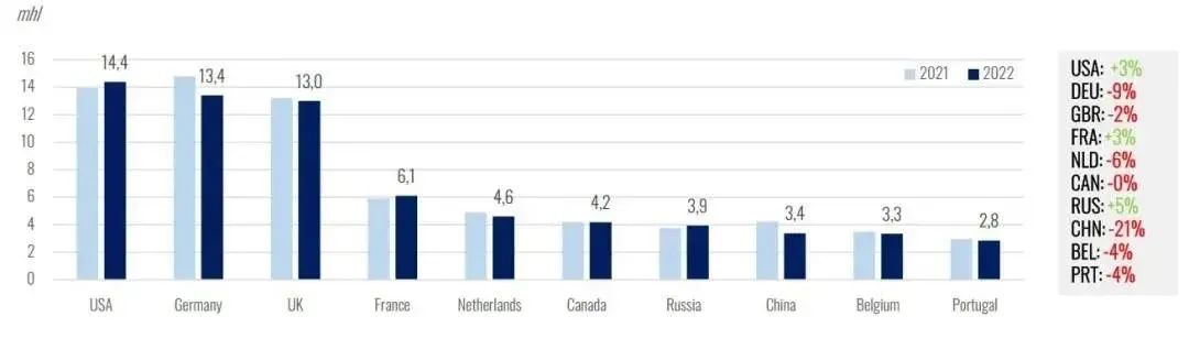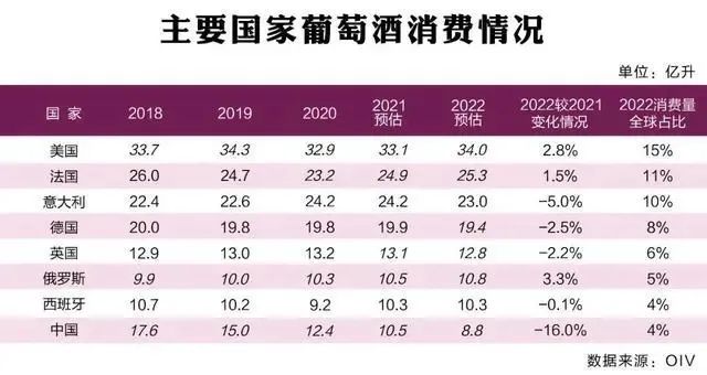到2022年,消费量已从17.6亿升下降到8.8亿升,完全腰斩,也是全球主要葡萄酒消费国下滑幅度最大的。
