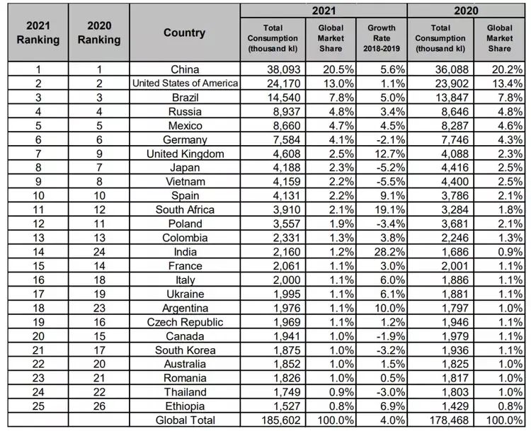 2021年全球各国啤酒消费量排行榜显示,大部分国家啤酒消费者保持增长