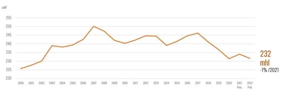 2022年全球葡萄酒消费量估算为232亿升,较2021年下降了1%。