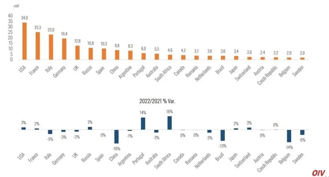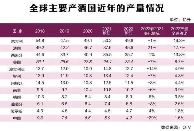2022年,中国的葡萄酒进口量为3.4亿升,较2021年下降了21%。