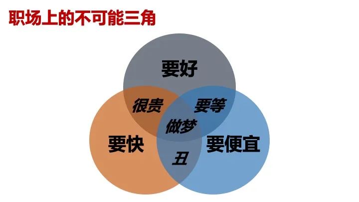 职场上有个经典的“不可能三角”,完美解释了这个情况(如下图):