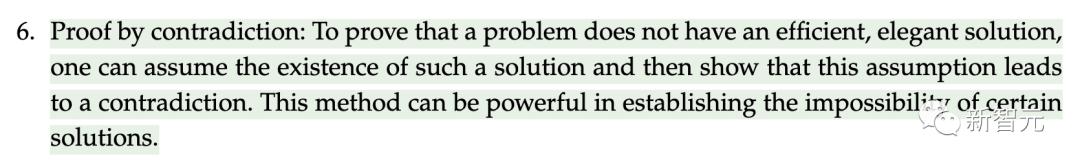 然后,它提出了六种方法,其中一种是「矛盾证明」,即要证明一个问题没有高效、优雅的解决方案,可以假设存在这样的解决方案,然后证明这一假设会导致矛盾,这样就可以有力地证明某些解法不可能存在。