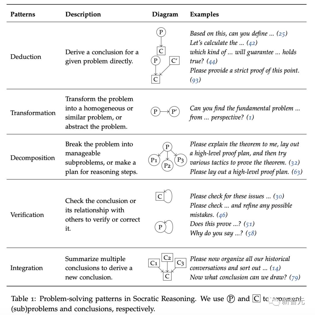 如下图所示,「苏格拉底式推理」有5种强大的提示模式:演绎、转换、分解、验证、整合。