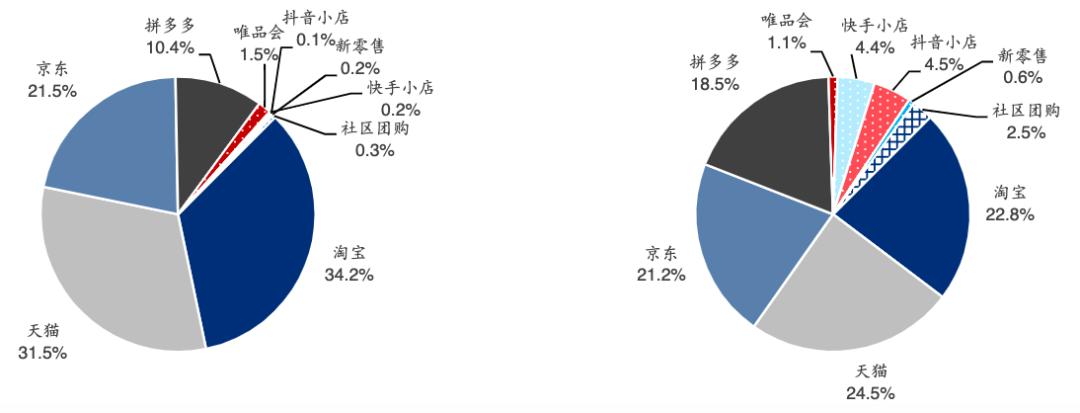 ▲(左为2019年电商平台市场份额,右为2022年市场份额。图源/华泰证券)