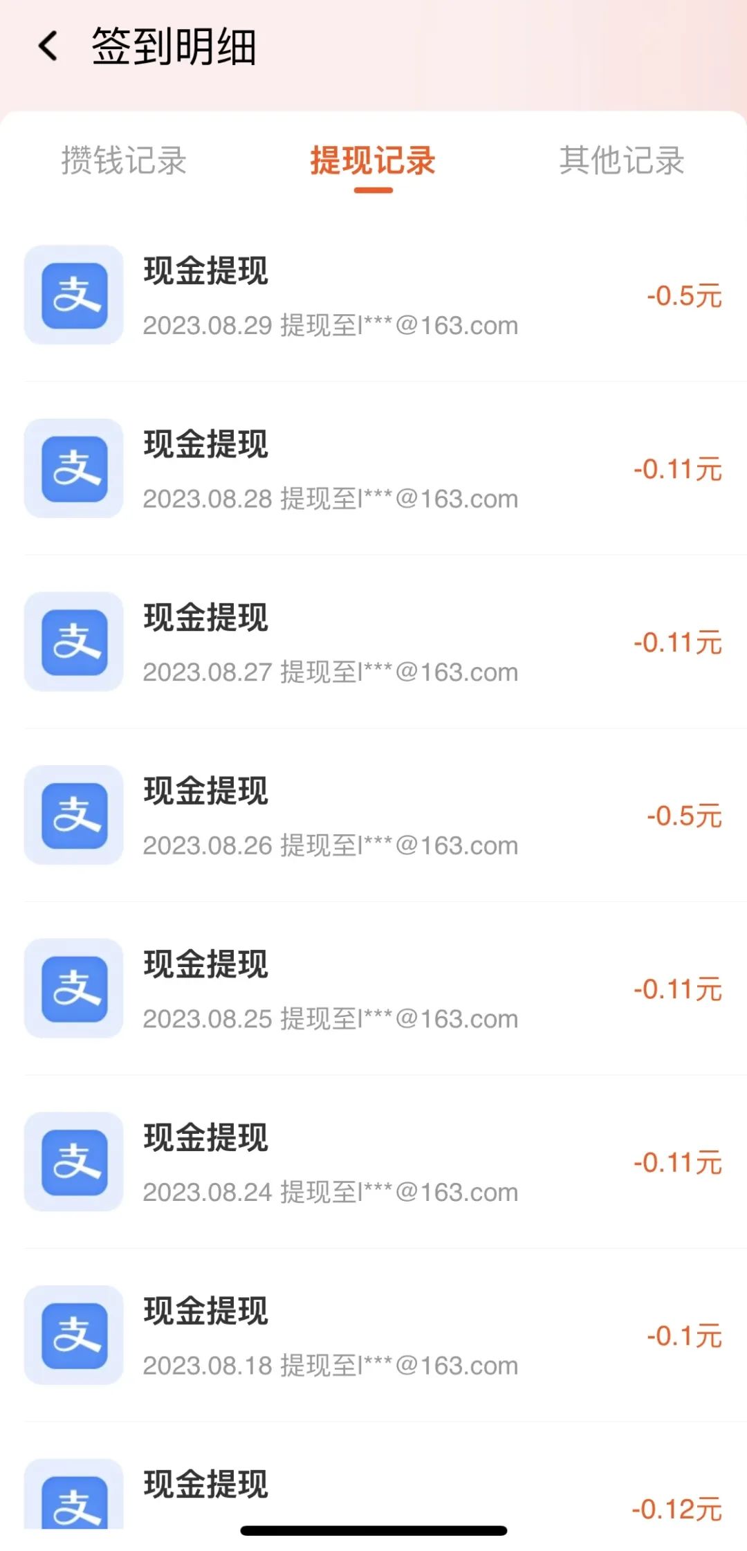 王梅向「市界」展示的签到淘宝提现记录显示,8月份断断续续的8次签到中,平均都能领1毛左右,最多的一次有5毛。
