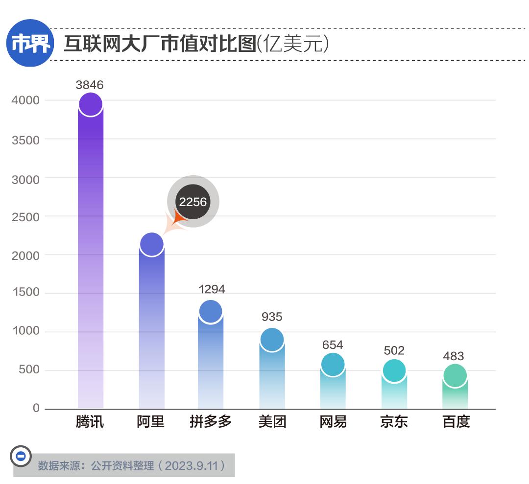 目前看,阿里的压力还是有点大。主要营收来源靠淘天集团的阿里巴巴,美股市值截至9月11日只有2256亿美元,比腾讯低了约1600亿美元。阿里巴巴与拼多多的市值差距,也已经从7000亿美元缩水到不足1000亿美元。
