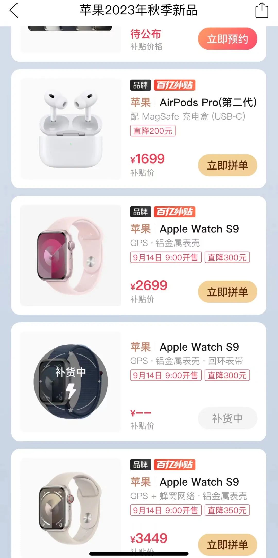 此外,在于今日开售的Apple2023年秋季新品AirPods Pro(第二代)、Apple Watch Series 9系列产品中,拼多多分别补贴200~350元不等,低于Apple官网首发价格。京东未有相应补贴折扣。