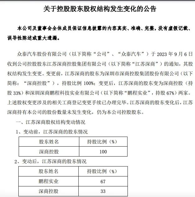9月6日晚间,众泰汽车发布公告称,其控股股东——江苏深商控股集团有限公司(即江苏深商)的股权结构发生变更,由深圳市深商控股集团股份有限公司(以下简称深商控股)一家公司全资控股变更为两家公司控股,且新股东控股权达到67%。