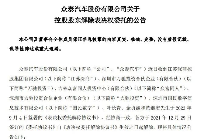 2022年2月25日,众泰汽车法定代表人和董事长均由胡水椟变更为黄继宏。至此,由黄继宏带领的江苏深商正式入主众泰汽车。