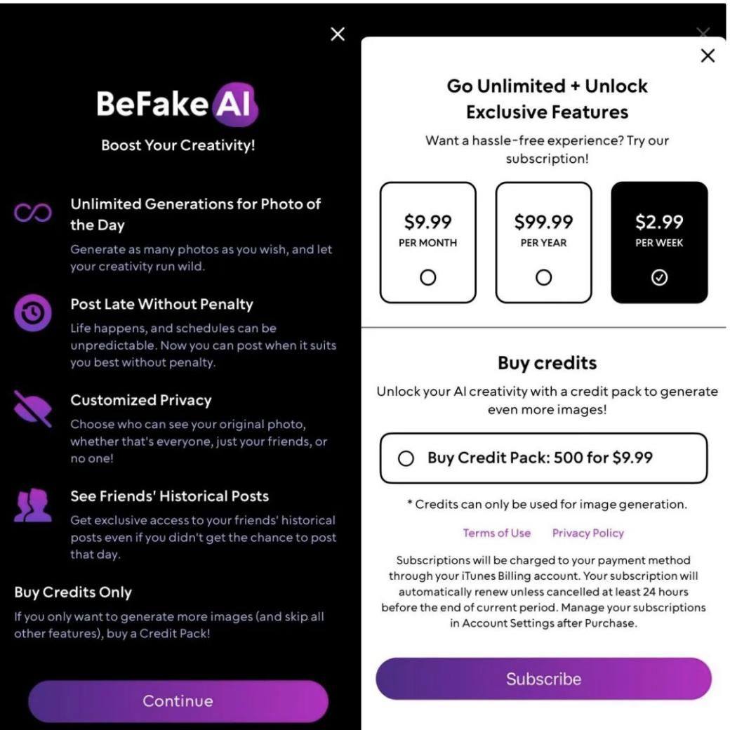 用户可以按照周、月和年度订阅 BeFake,订阅费分别为 2.99 美元/周、9.99 美元/月或 99.99 美元/年,此外,还可以单独购买积分点数,500 点数只需 9.99 美元。