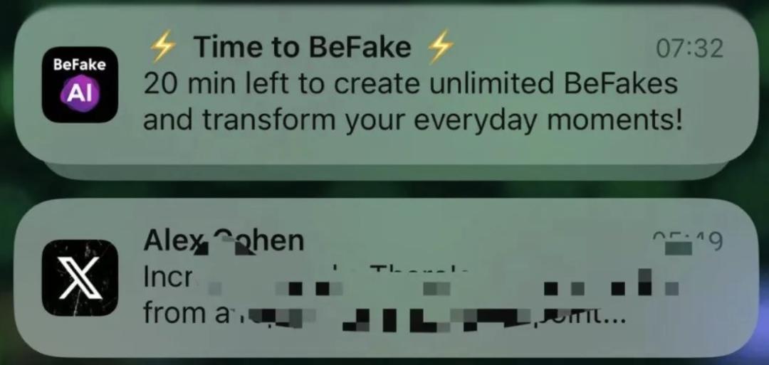 用户完成手机号注册、建立账号后,就可以开始接收通知,并与 BeFake 社区互动、自由添加好友、浏览 AI 生成的图片。