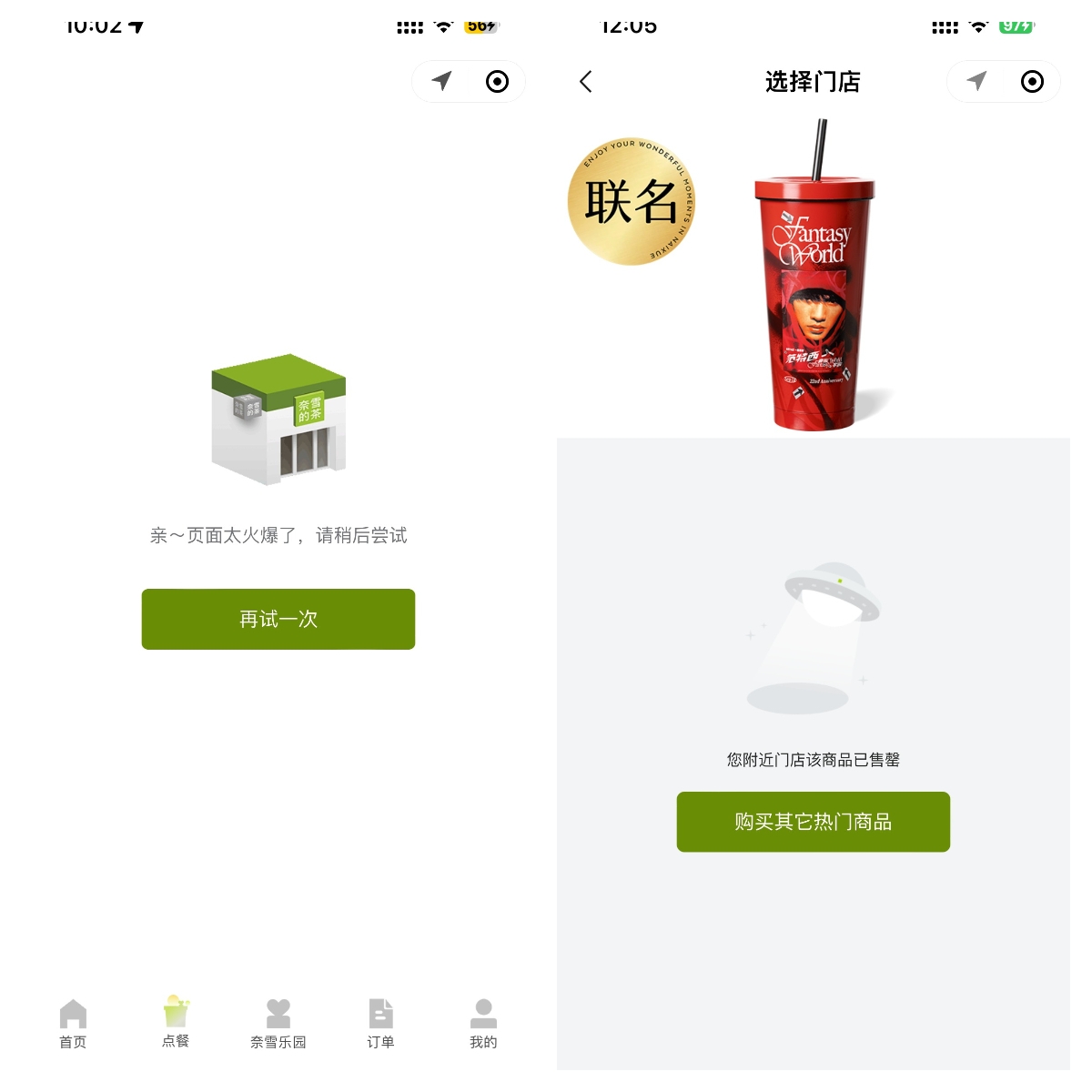 这场联名活动时值专辑发售第22年,相关产品一经上架门店菜单,便迅速引起杰迷蜂拥抢购。36氪昨今两次测试发现,联名产品几乎“一杯难求”,今日开售后,奈雪的茶小程序更是一度因过于火爆,无法点单,部分门店在午间便挂出“暂停营业”告示。