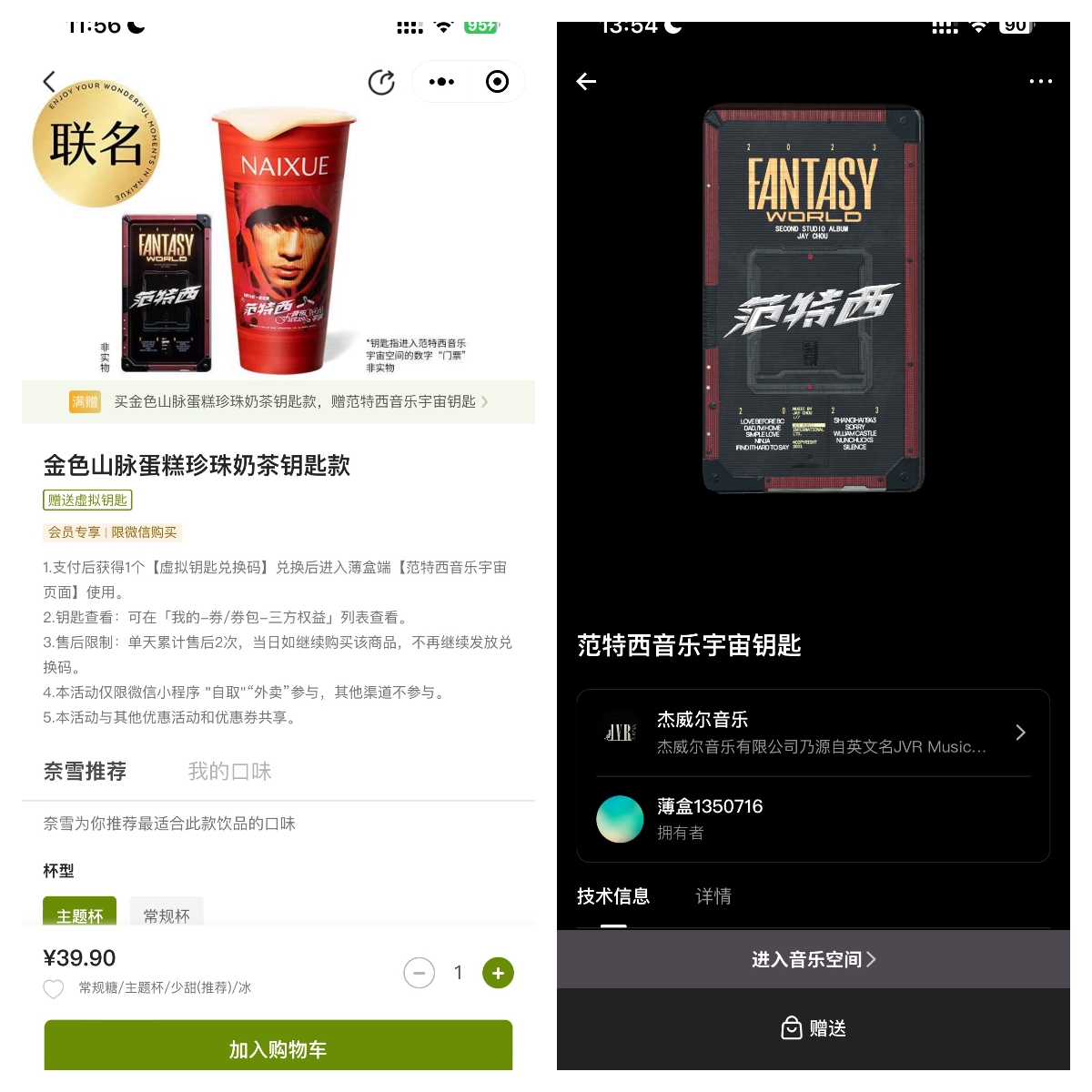 奈雪虚拟钥匙联名套餐(左),薄盒范特西音乐宇宙(右)。图片截自官方应用