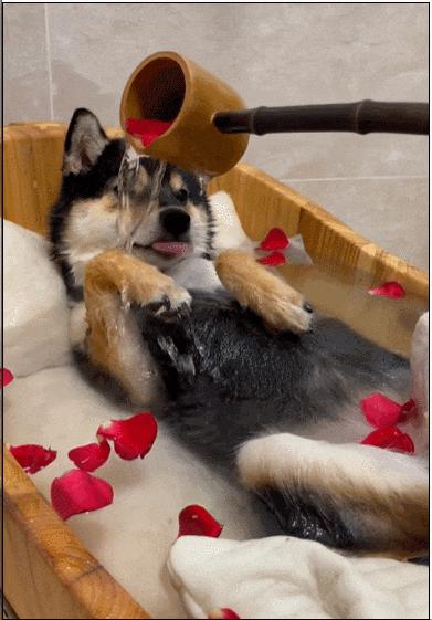 有时候是玫瑰水疗,花瓣随着水流落到曼玉的肚皮上,让它享受得直吐舌头。