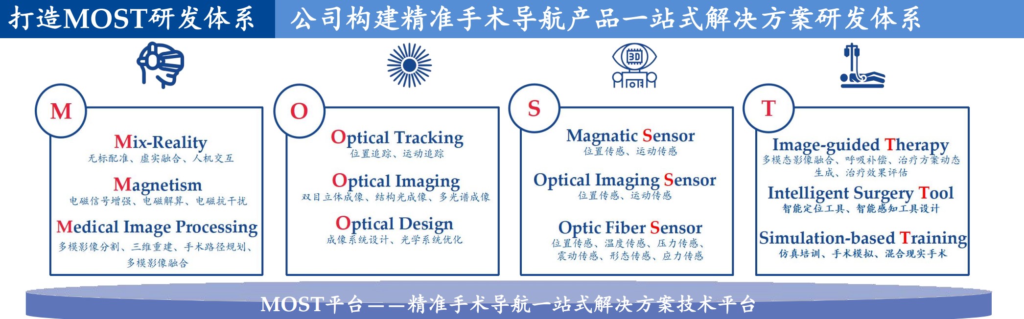 这套体系被命名为“MOST”。其中,M指代Mix-Reality、Magnetism等概念,强调医学影像分析、增强现实配准的功能,是手术机器人、术前规划等环节必备,例如将CT片进行肿瘤、血管、神经分割后做三维重建,继而开展智能手术规划等;O和S主要强调硬件产品,如前述的光学和电磁定位设备,以及各类传感器开发;T指治疗方案,如手术工作、仿真训练软件。