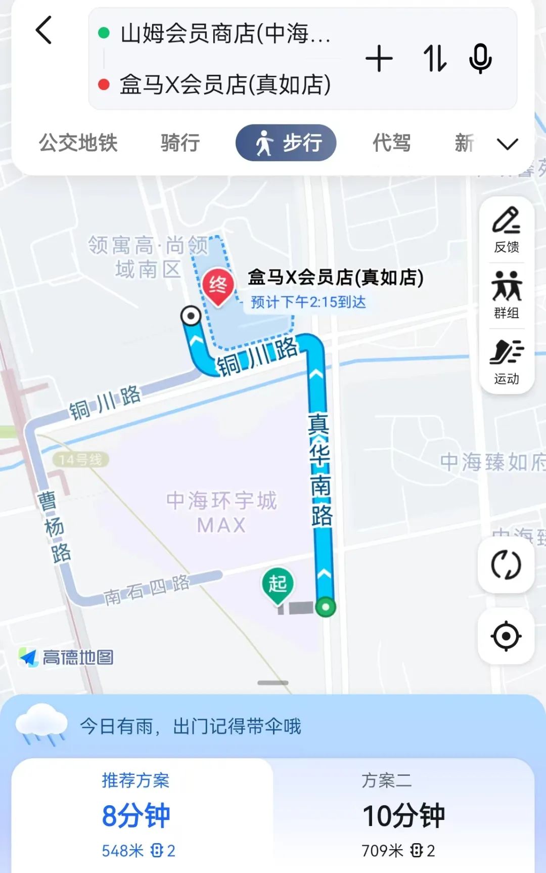 从地图上可以看到,在这段步行距离仅500多米的道路两端,分别坐落着盒马X会员店和山姆会员店两家门店。