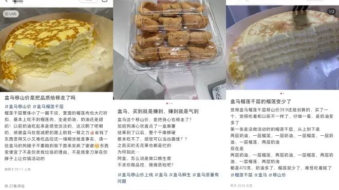 除此之外,最被消费者诟病还有品控,在盒马大举推出移山价后,社交平台上关于其品质下降的质疑也与日俱增。