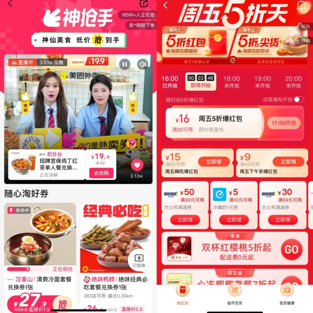另外,美团的“神抢手”直播间每天都提供大量的外卖折扣券,饿了么则持续有各种免单、5折等促销活动。如果在周六日打开美团或者饿了么,往往还会有额外的周末狂欢。