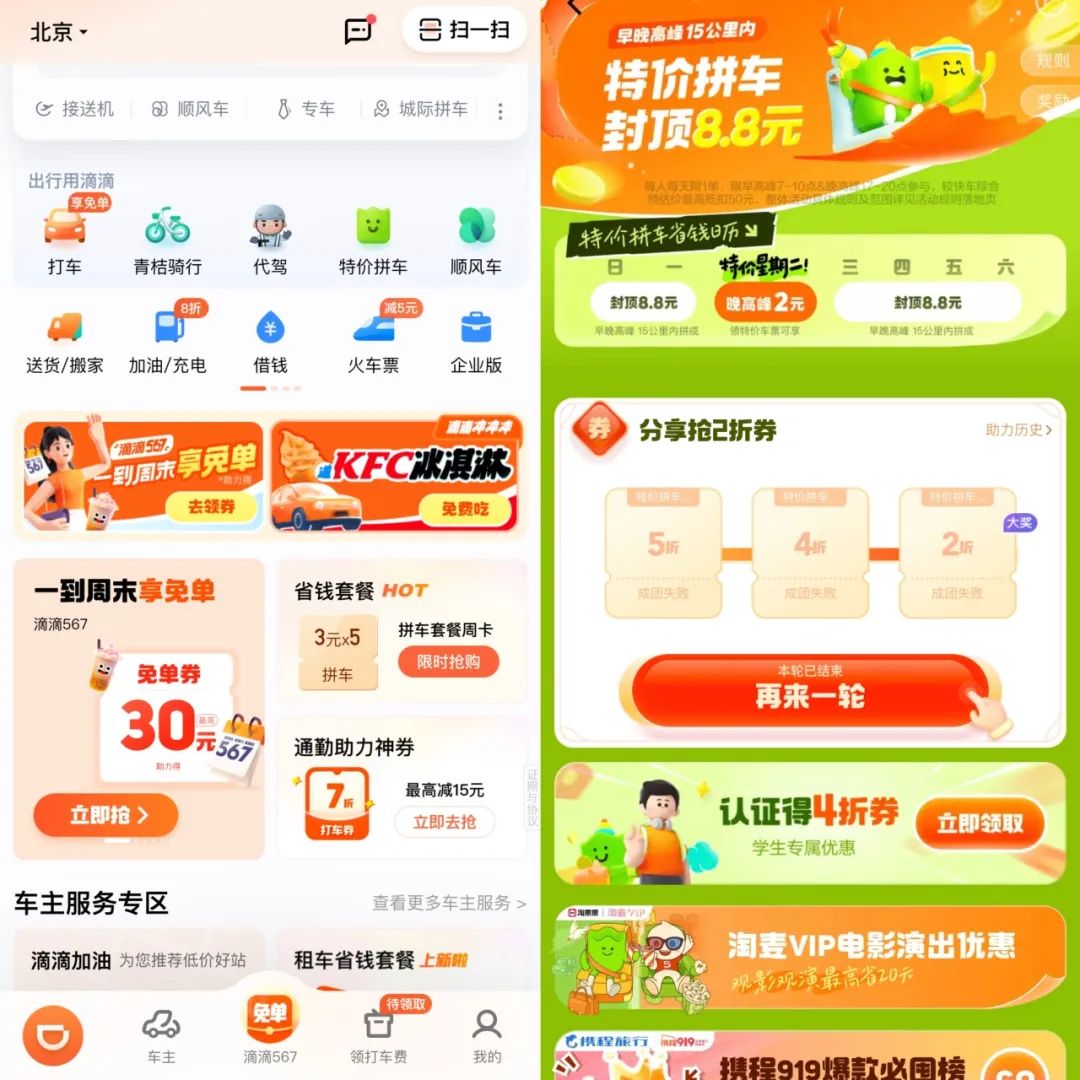 周末抢免单、周末抢5折、通勤抢免单、热门目的地9.9元、15公里内拼车8.8元……网约车的价格战今年也被重新挑起。