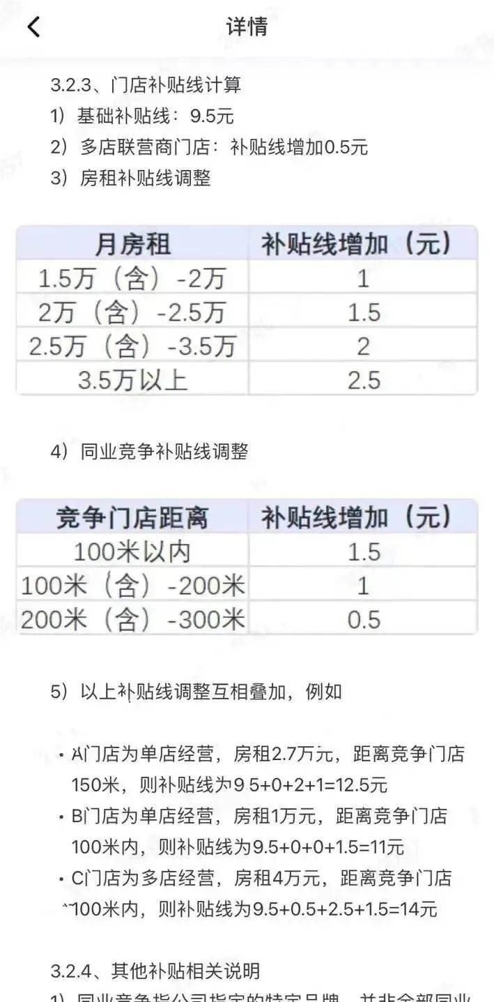 原有的基础补贴、多店补贴、房租补贴、同业竞争补贴调整后变成可叠加,其中“同业竞争补贴”直接针对瑞幸——库迪加盟商100米距离内有瑞幸门店的,增加1.5元补贴、200米内的增加1元补贴、300米内的增加0.5元补贴。同时,房租补贴线上调,并新增了外卖平台补贴。