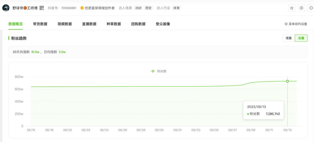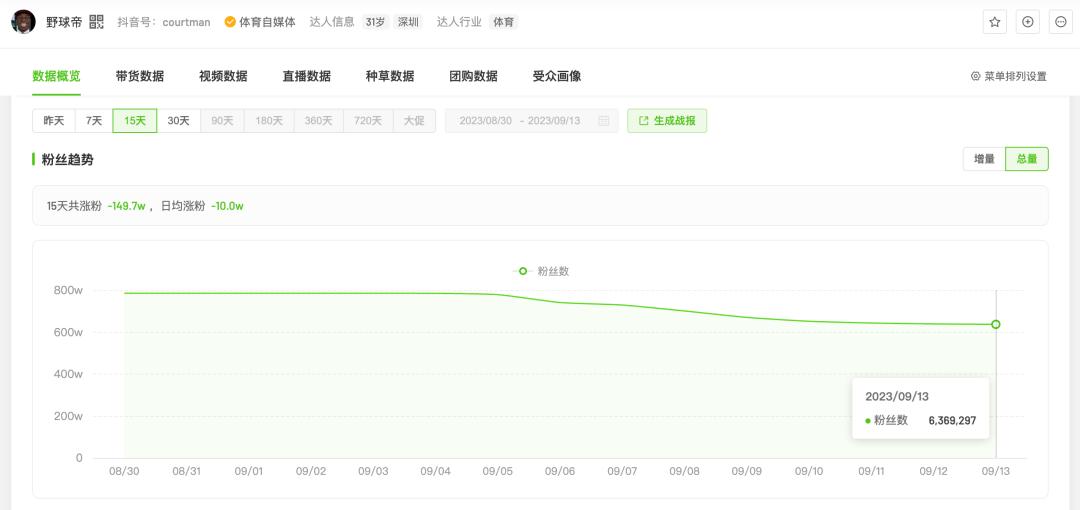 从粉丝量的变动来看,可以清晰地感受到这场风波对于野球帝的影响。据体育大生意查询飞瓜数据显示,官方抖音账号“野球帝”的粉丝量从8月30日的785.4万,下降至9月13日的636.9万。相反,王师傅的官方抖音账号“野球帝🏀王师傅”的粉丝量则从8月30日的642.7万,上升至9月13日的728.0万。
