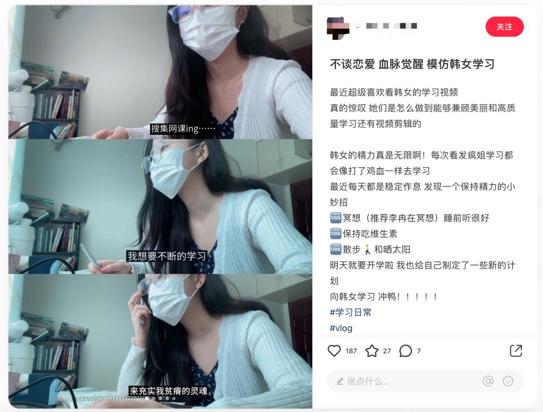 最近,以“发疯姐”为代表的韩国学习博主们在小红书等社交平台上走红,网友们甚至将这一类“玩命儿”式学习的韩国学习博主们统一用“韩女”来代称。提到学习博主届的“韩女精神”,指的就是那些卷到极致、疯狂学习的状态。
