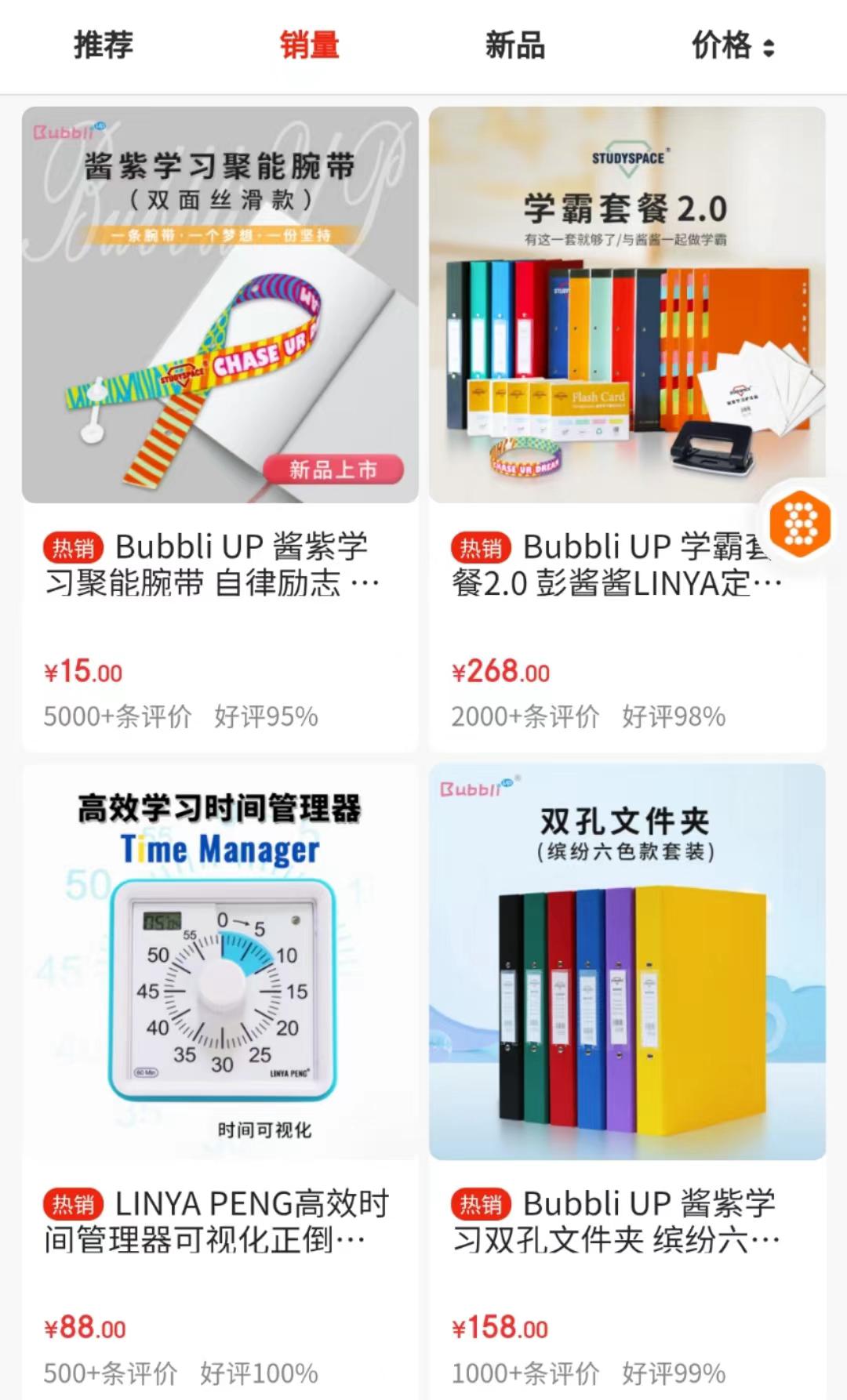 也有极少数学习博主自创了品牌,比如@彭酱酱LINYA就推出了文具品牌Bubbli UP,主要有高效记忆卡、拍纸本、学习计时器、文件夹、双肩包等产品,定价都不低,其中学院双肩包定价999元,学霸套餐定价268元,学霸套餐在京东旗舰店上有2000多条评论。