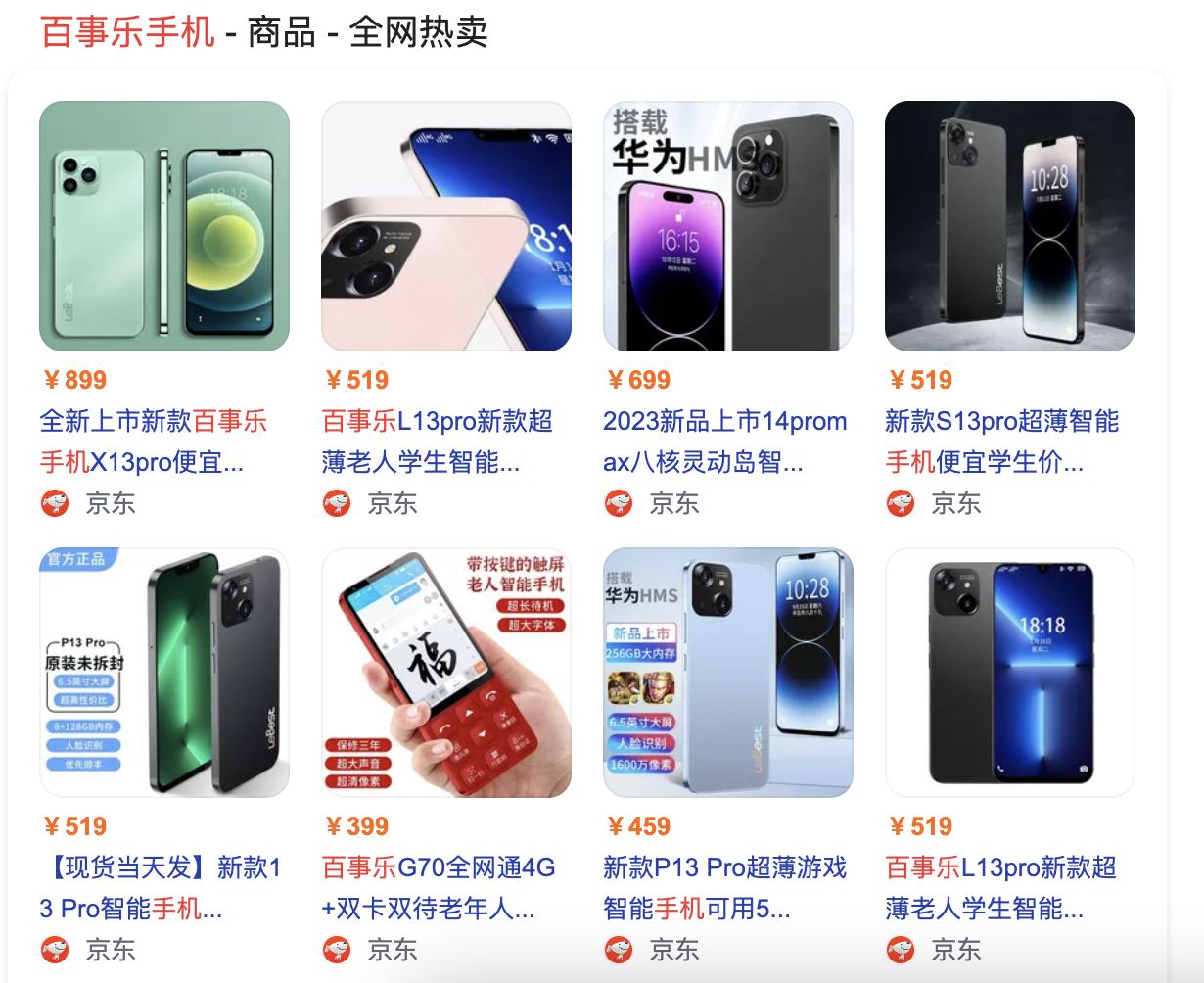 「自象限」通过对电商平台对图中百事乐手机品牌进行检索发现,百事乐实际上是一家以“山寨”为主的低端手机品牌。外形模仿苹果,系统模仿华为,还引入了小米Ultra的背屏设计,堪称当下主流手机的Mix版本。该品牌手机售价大多是在459元——699元之间,最新款也仅卖899元一台。