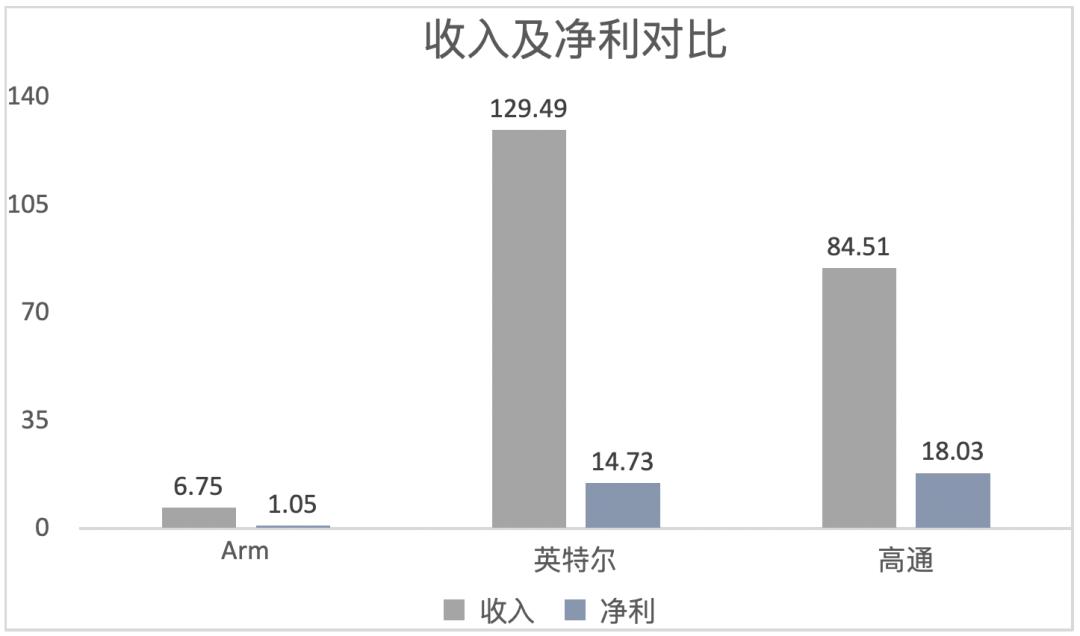 截至6月30日财季,Arm收入为6.75亿美元,净利润1.05亿美元。同处CPU赛道的英特尔在截至7月1日财季收入和净利润分别为129.49亿美元、14.73亿美元;高通在截至6月25日财季内,收入为84.51亿美元,净利润18.03亿美元。