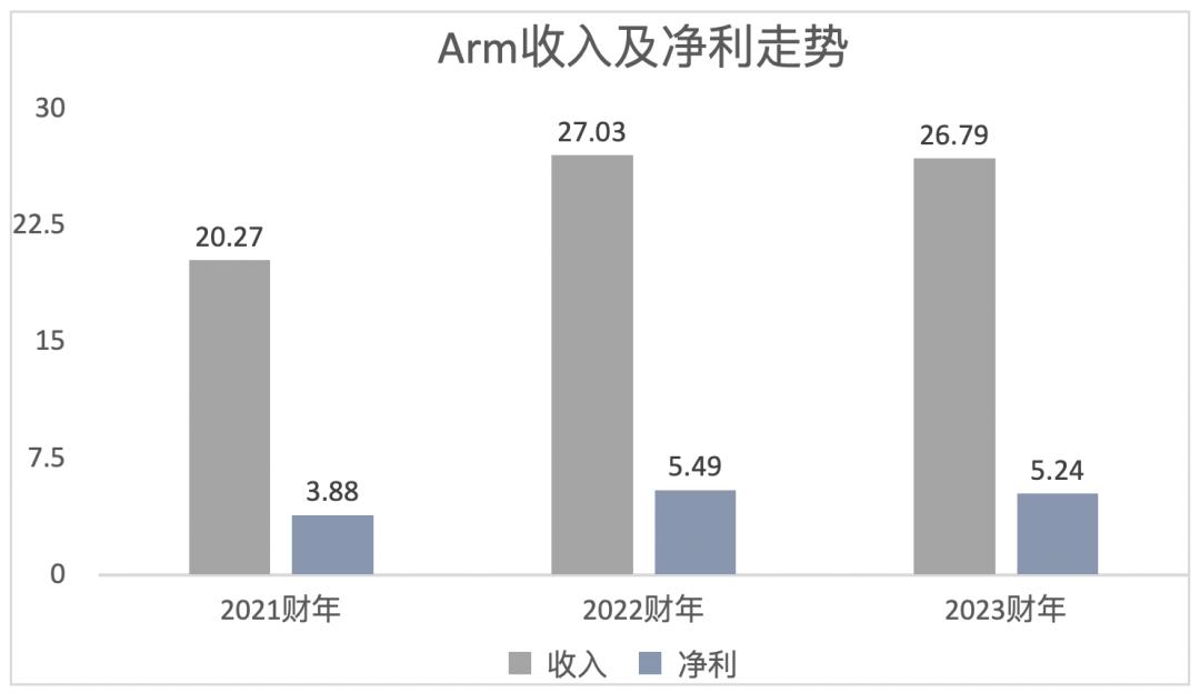 不过,在出货量稳定增长的同时,Arm的收入和利润却在最新财年出现了小幅下滑。2021财年至2023财年,Arm收入分别为20.27亿美元、27.03亿美元、26.79亿美元;净利润则为3.88亿美元、5.49亿美元和5.24亿美元。