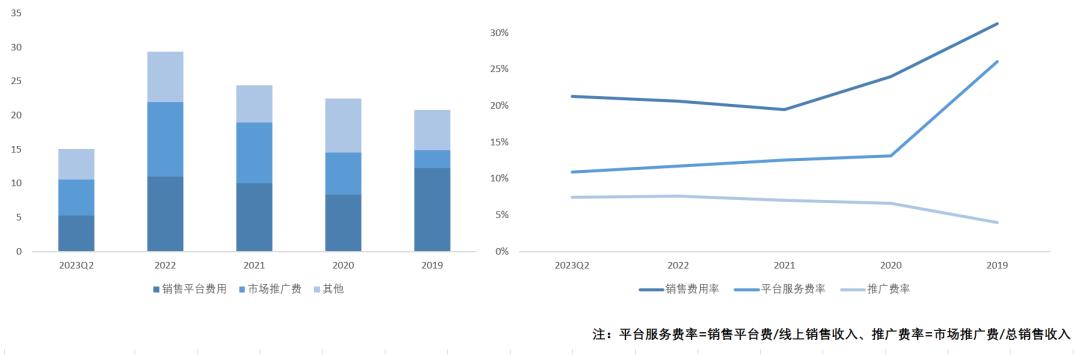 数据显示,2020-2022年,安克创新的销售费用率高达20%+,除去相当一部分支付给亚马逊等电商品台的“过路费”,其余的则主要以营销推广费用为主,金额则从2019年的2.64亿元一路冲高至2022年的10.88亿元。(在2020和2021年,安克创新的销售费用率分别有过两次大幅的下降,2020年是由于新会计准则下部分平台费用转入营业成本,2021则是因为新会计准则下运费计入营业成本所致,最终导致销售费用率下降,毛利率下降。)