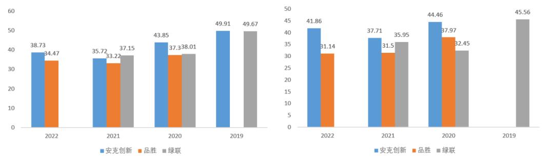 图:安克创新与同业综合毛利率对比(左)、充电业务毛利率对比(右) 资料来源:Wind、36氪整理