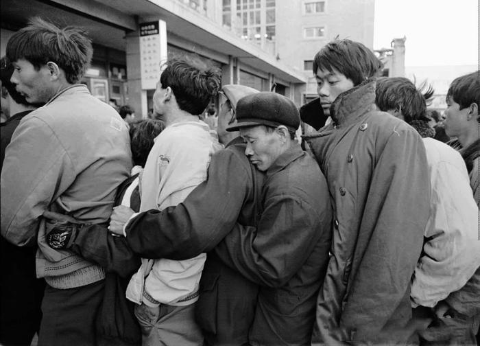 我们看下面这张1995年的春运老照片,旅客只能在售票厅门口排队买票。