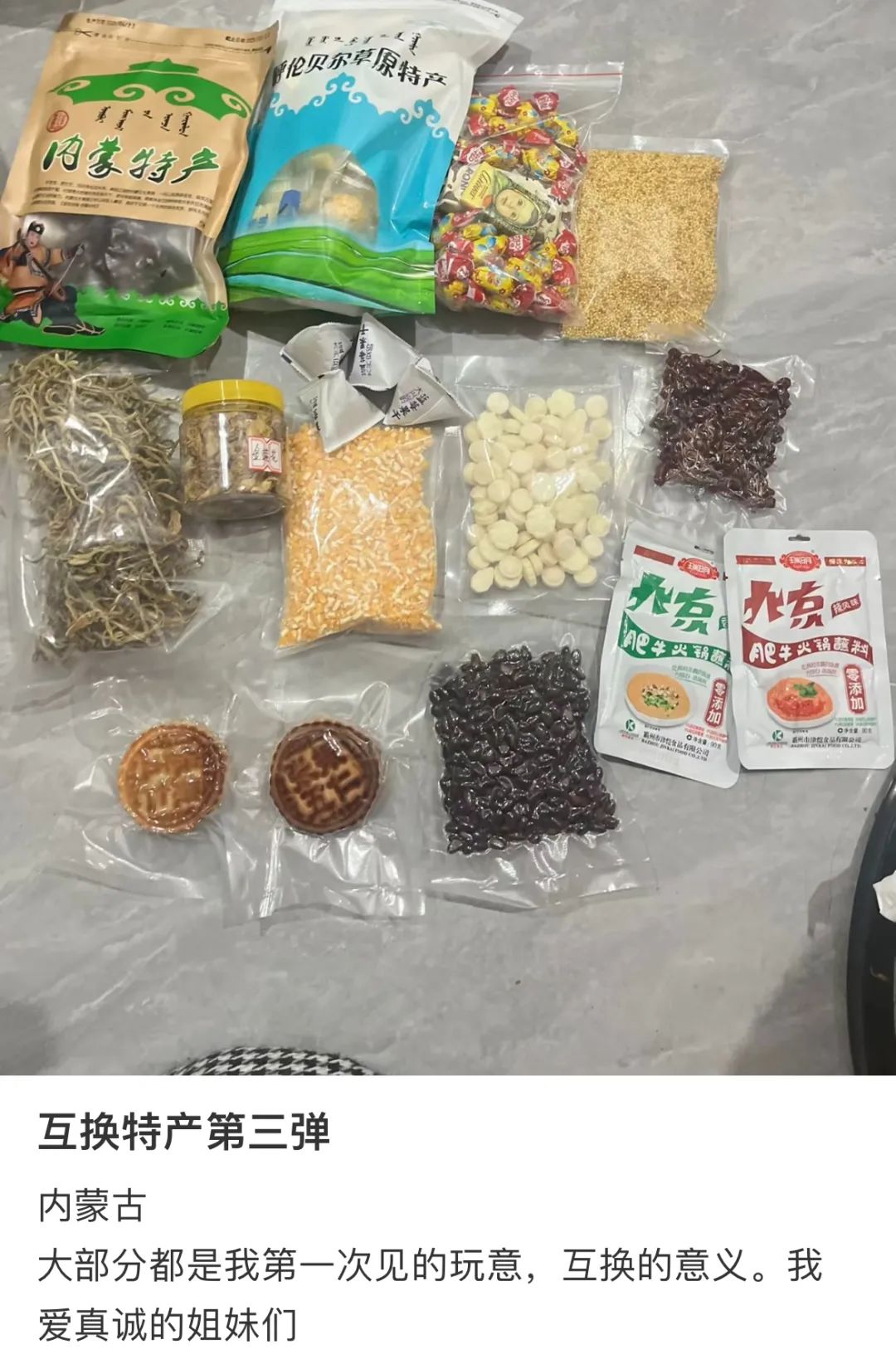 王心对此深有感触。作为内蒙古人,她的互换特产邀请帖子收获了大量的回应。其他省市的特产,网友们或多或少有过接触,但大多数人对内蒙古的特产知之甚少,想要互换的原因是“没吃过”和“好奇”。
