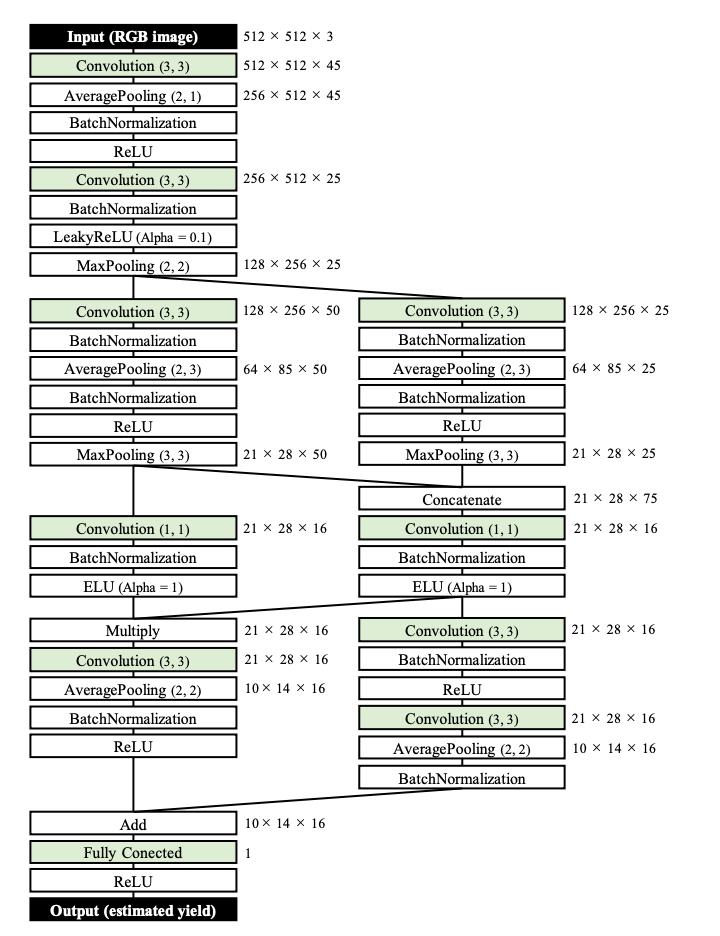 CNN 模型在 Main Stream (MS) 中有 5 个卷积层,Branching Stream (BS)中有 4 个卷积层。模型的池化层包括平均池化层 (AveragePooling) 和最大池化层 (MaxPooling)。激活函数主要为整流线性单元 (ReLU),在某些部分使用指数线性单元 (ELU)。最后 MS 和 BS 汇合,通过 ReLU 层输出预估的粮食产量。