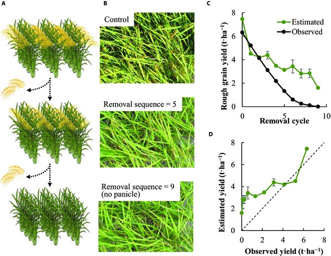 于是,研究人员通过花序移除实验,验证了花序在产量预测中的作用。他们从每株水稻上摘下两个花序,拍照并统计粗粒产量,直到花序被全部摘下。