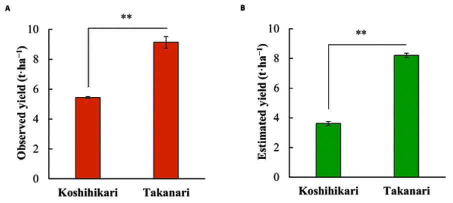图 5:高成水稻和越光水稻的实际产量 (A) 和预测产量 (B)