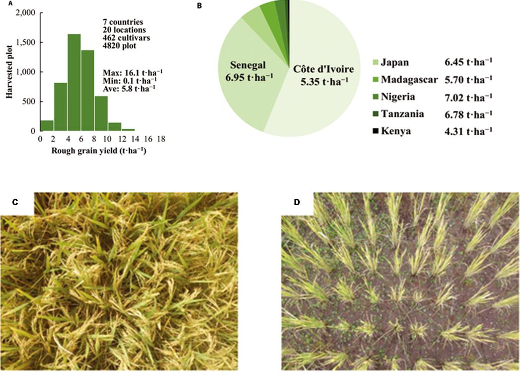 研究人员在 7 个国家的 20 块农田中采集了水稻照片和粮食产量。水稻成熟后,用数码相机在水稻冠层上 0.8 至 0.9 米的高度,垂直向下拍摄,得到面积 1 m2 水稻的 RGB 照片。